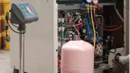 通過電子秤準(zhǔn)確補(bǔ)充液態(tài)制冷劑量;充注時(shí)請(qǐng)注意制冷劑瓶的方向。